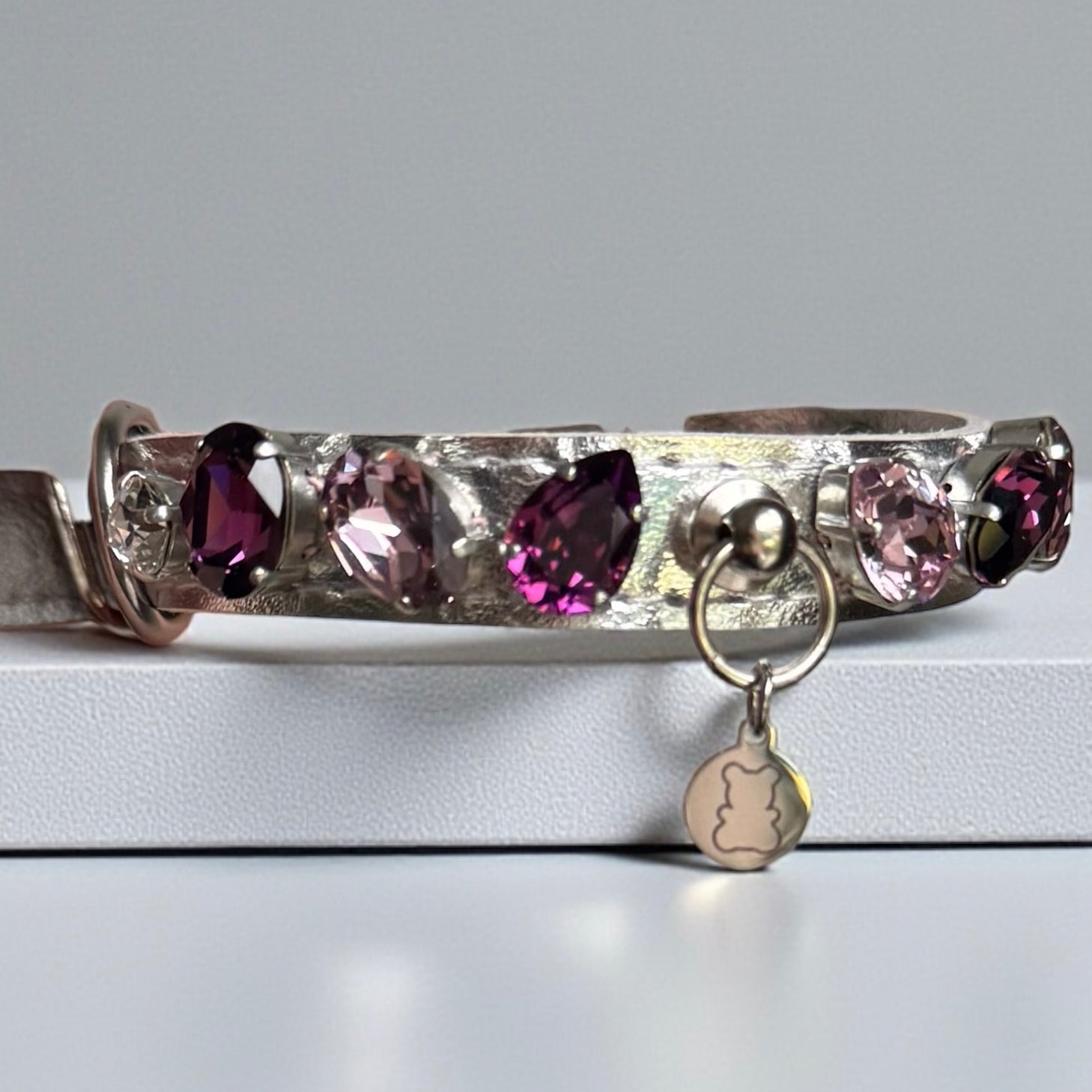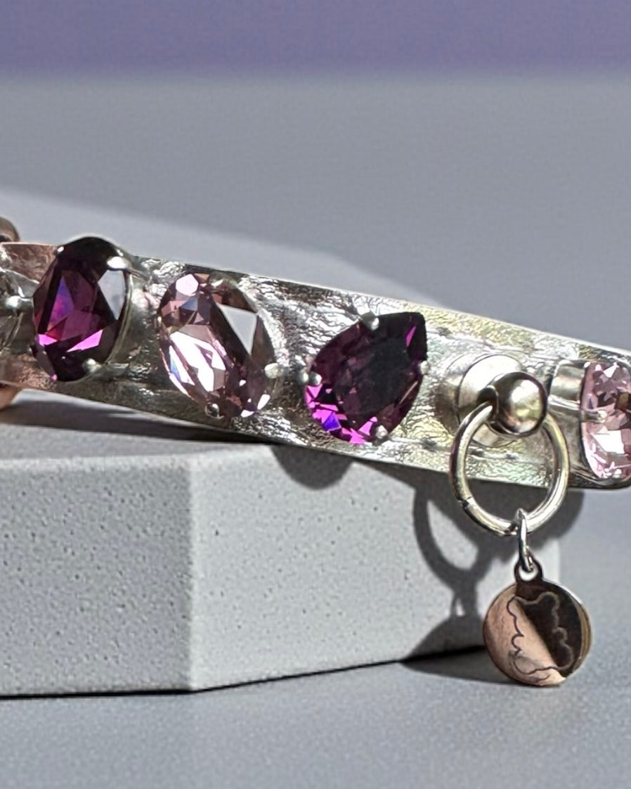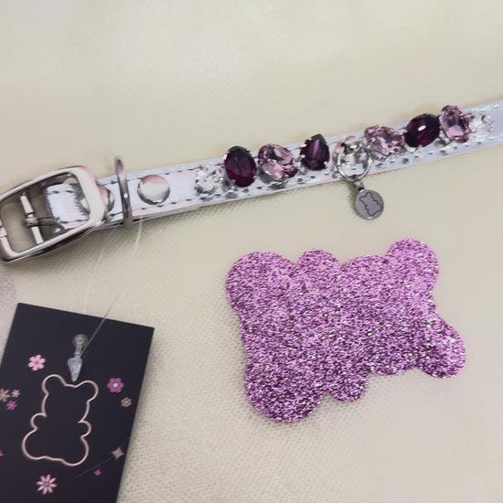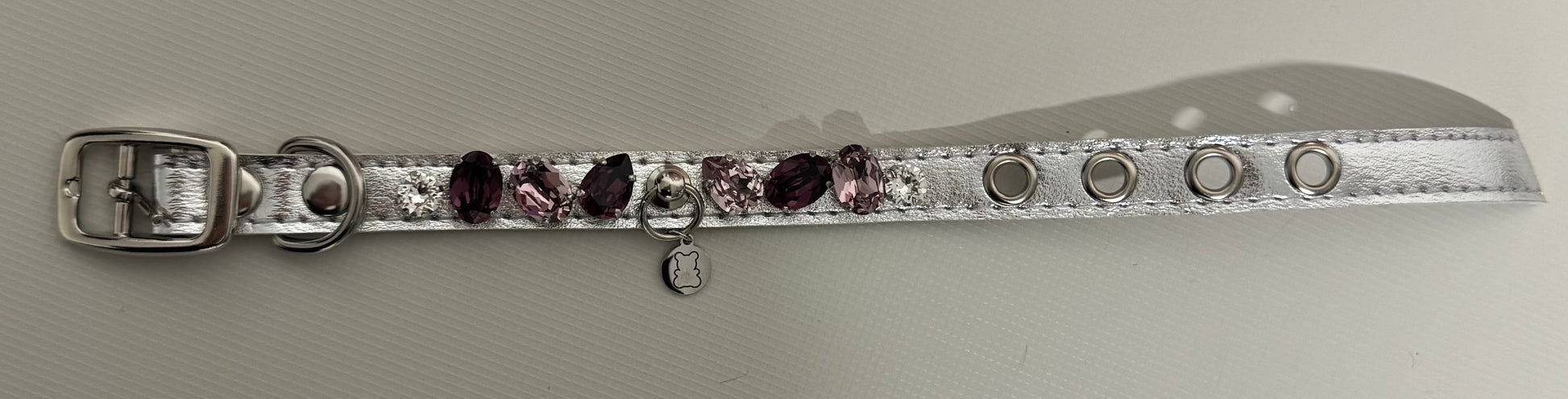 Collier pour chien en cuir vegan argent, décoré de cristaux Swarovski brodés et sertis à la main.